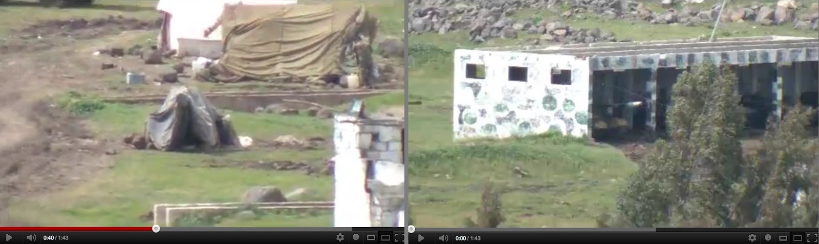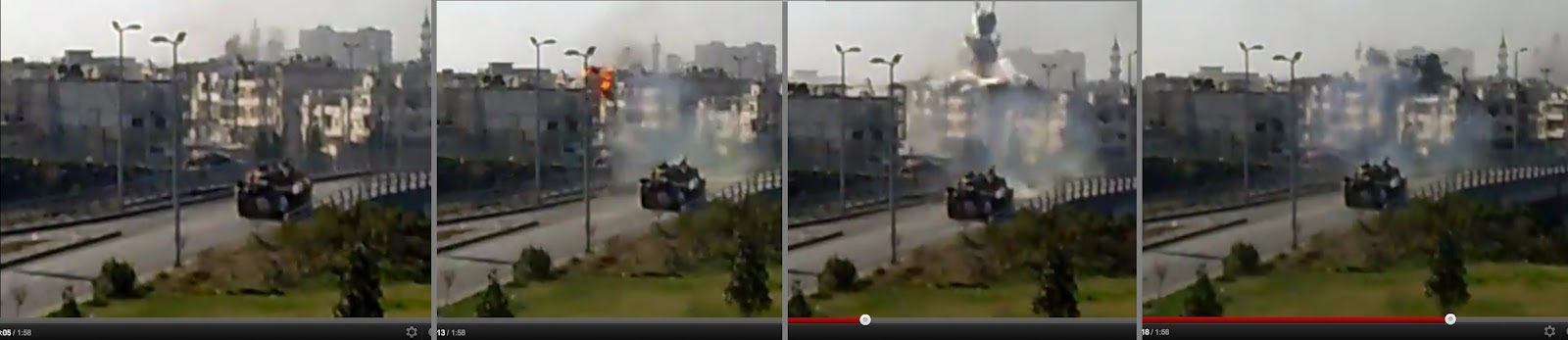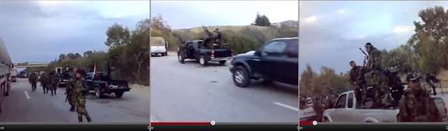 In the centre frame above is a twin barrel heavy machine gun. This is very likely to be a ZPU-2 - a 14.5 mm Soviet/Russian anti aircraft gun. I also believe there was one or more of the single barrel version of this weapon (the ZPU-1). The four barrel version (ZPU-4) has been reported seen and also filmed earlier in Hama (go here and scroll down some).