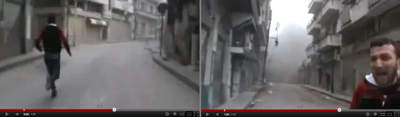 | three frames from the video linked-to above. Originally found on bolna66's YouTube channel. The video is now posted here, and is said to be from Douma, a Damascus suburb. |